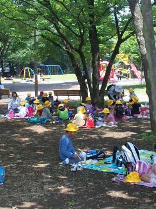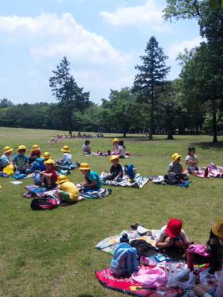 1年生はみんなでお弁当タイムに入りました。キャラ弁なども登場し、みんなでわぁ〜といいながら、楽しく食べています。たくさん遊んで食欲ももりもりです。