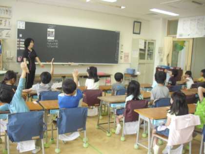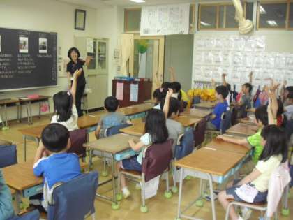 学校にはたくさんの教職員がいます。知っている先生についてたずねることをきっかけに学校で働く人たちのことについて調べてみようという意欲を引き出していました。授業の事前に教材として使う先生の写真を袋から少しのぞかせ、興味をひきつける手法に、みんな引き込まれ、意欲的に発言していました。みんなたくさんの先生方と知り合いになってくださいね。