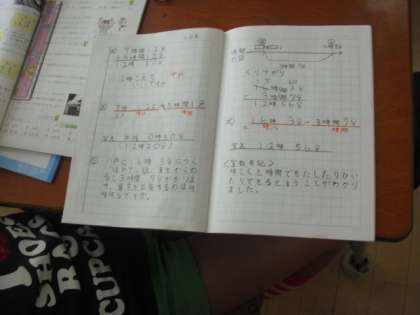 時間と時刻の学習をしている3年生。今日は問題に挑戦!分かっていることを手がかりに新幹線の出発時刻、到着時刻などを求めていました。図に関係を表しながら解決方法を説明します。「時間も計算できる」と発見していました。