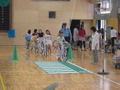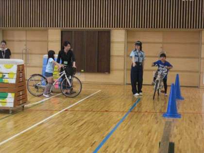 学年の半分が体育館で、教えていただいたことを実際に自転車に乗って