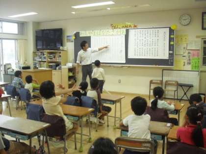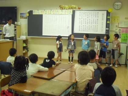 おもしろさを皆に発表した後、動作を交えての音読を繰り返して、班ごとに練習です。この後音読発表会へと続いていきます。みんな頑張って〜