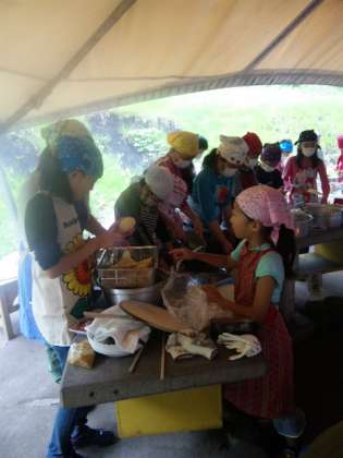 夕食はカレーライス、自分達で作らないとありません。役割分担をしながら、頑張っています。かまどの火がなかなかつかず悪戦苦闘しましたが、今着々と進んでいます。