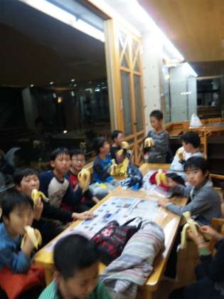 入浴後にバナナを食べて、就寝準備にはいりました。室長は室長会議で明日のことについての連絡をメンバーに伝えます。今日はこの後消灯です。明日の起床は6時です。今日一日楽しい思い出が作れたでしょうか。ゆっくり休んでまた明日頑張りましょう。