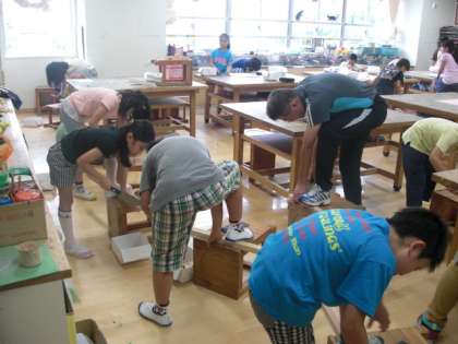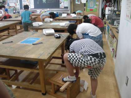 4年生の図工では、のこぎりで積み木作りの真っ最中。