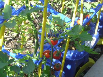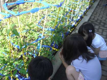 2年生が生活科で育てているミニトマト、青い実が赤く色づき子どもたちが収穫し始めました。今日もお世話をしています。たくさん赤いミニトマトがとれますように・・・