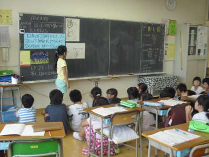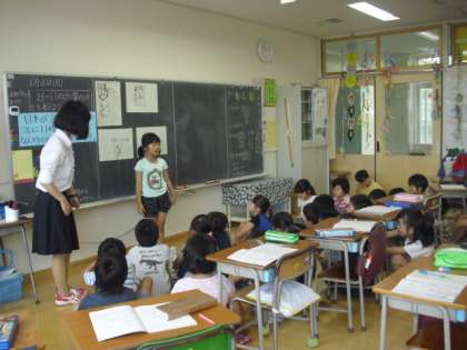 2年生の教室ではたしざんで学習した時の解決方法を思い出しながら、新しい2けたの引き算の計算の仕方を考える学習が行われていました。自分なりの方法で解決し、みんなの前で発表です。自分の考え方と同じか違うかを考えながら学習していました。