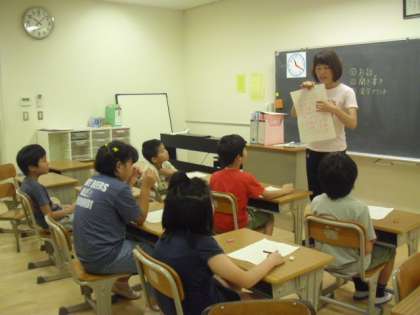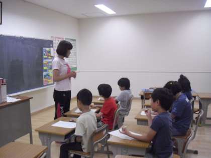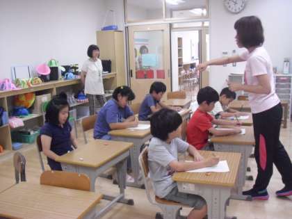 別のグループでは、先生が話した通りに聞き取って用紙に書く練習です。ひらがな、習ったカタカナ、漢字などを上手に使って書けたか先生がチェックをして、○をもらって嬉しそうでした。