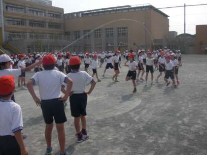 体育朝会の中で行われる「長なわ大会」、今朝は今年度の第1回目です。