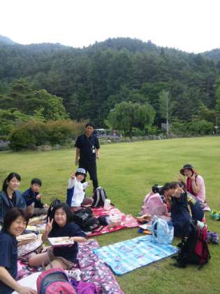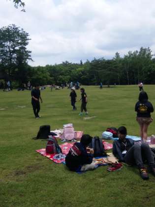 野鳥の森公園でお弁当タイム〜その後ボール遊びが始まりました。今のところ天気ももっていて、予定通り進めています。