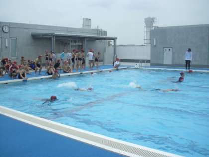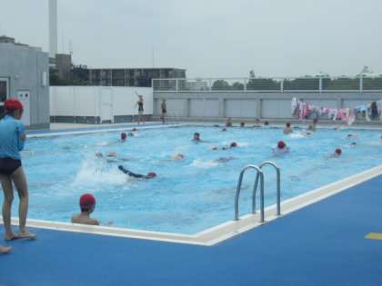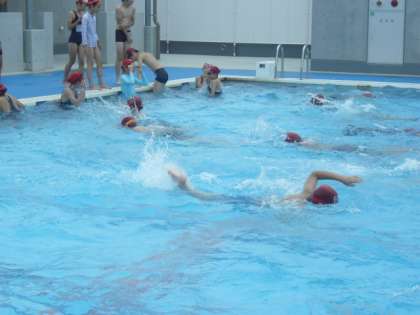 6年生は、それぞれの目標に向けて泳ぎの練習です。25m、50mと距離に挑戦するコース、平泳ぎに挑戦するコースなど課題別コースの学習展開です。自己の目標達成をめざして、みんなかんばれ〜