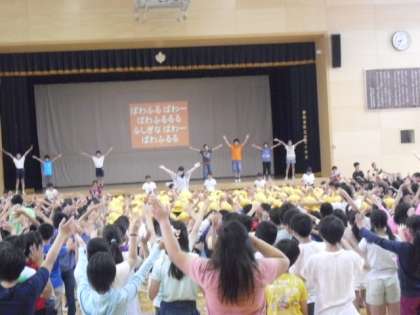 今日は体育館で音楽朝会がありました。音楽委員会の児童の演奏のもと、みんなでパワフルパワーを歌いました。途中で曲にふりをつけて・・・、もうみんなでパワフルパワー全開です!今日も一日みんなで元気に過ごしましょうね!