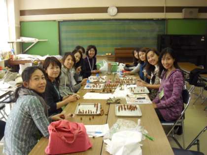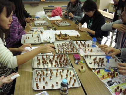 学校支援で活動していただいている「あしか隊」です。今は、12月12日(土)の校舎お別れ会に向けて準備をしています。その一つがこの記念品づくりです。なくなってしまう学校のヒマラヤ杉を切った台にどんぐりが乗っています。かわいい顔がついていて表情豊かに仕上がっています。この台に「ロカラス」のロゴがつくそうです。