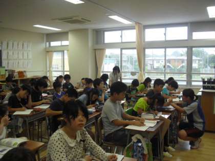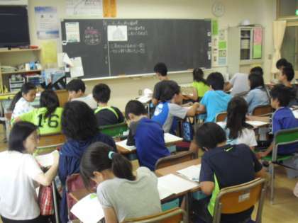 6年生は、いろいろな形の面積を、形の概形をとらえて、知っている公式などを活用して求める学習です。およそ三角形とみたて、底辺になる長さ、高さになる長さを使って三角形の面積を求める公式にあてはめ計算で求めます。6年生の算数でも複数の指導者での協力授業を行っています。少しでも、自分で解決する機会や、「できた、わかった」と言える機会が増えるよう支援しています。