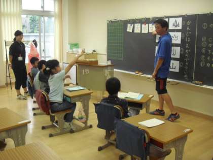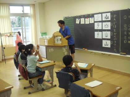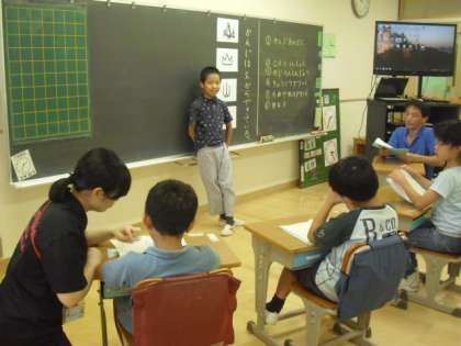 別のグループでは遊びながら漢字に親しむ学習です。漢字の音読発表をし、みんなで声をそろえてCDのリズムにあわせて音読、漢字が絵から変身してきた過程も確認しました。