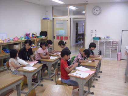 聞いて理解する力、聞いて書く力を伸ばすグループでは、お話の読み聞かせをし、内容についてクイズを行っていました。また50文字程度の文章を聞いて紙に書きます。その後は漢字のテストに挑戦しました。