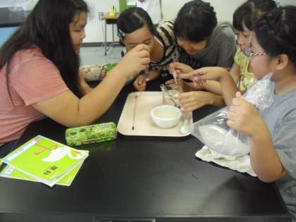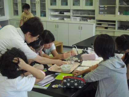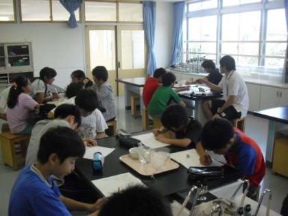 理科室では6年生が理科の実験の最中です。実験の結果からどんな変化がみられるのか、注意深く観察してノートに記述していました。