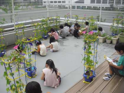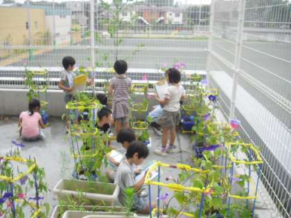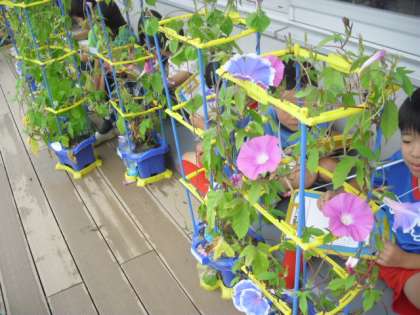 大事に育てたあさがおが素敵な花を咲かせています。今日はみんなでその様子をカードに記録していました。「大きな花がさいたよ」「かわいい花もある」「この膨らみは何だろう・・」と気付きをもとに知りたい心も膨らんでいました。