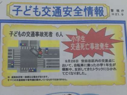 成城警察署の交通課の方から交通事故についての話がありました。左折車に注意し、アイコンタクトが必要だと話がありました。また、夜道で暗い色の服は目立たないので、白か黄色を着て運転手から見えやすくすることも大切だいう話もありました。