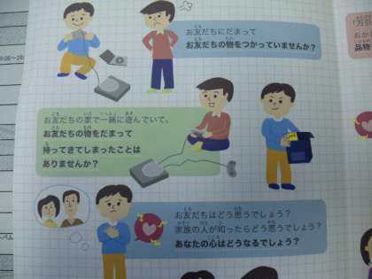 今日は「万引きはダメ!」というパンフレットをいただきました。その中に「お友だちにだまってお友だちの物をつかっていませんか?」という言葉がありました。この頃の子どもには多いことではないでしょうか。ここからトラブルが発生することもあるかもしれません。私たちは子どもたちの遊んでいる様子をよく観察する必要があると感じました。