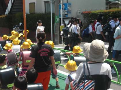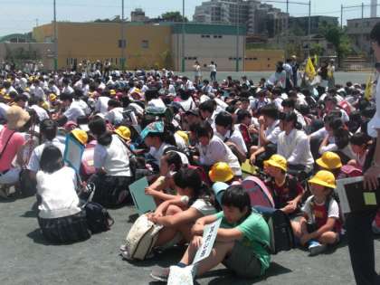 校庭にまず小学校全児童が校外班ごとに集まり、