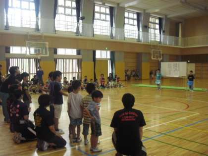 ひかり学級は、いつも歌っている歌「みんな大好き」を歌いました。会場のみんなに「うみ」と「そら」チームにわかれてもらい、どちらが元気に歌うのか勝負しました。結果は・・・・どちらも頑張ったので、「引き分け〜」