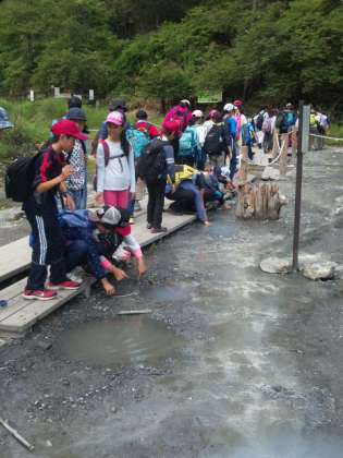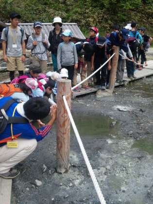 源泉を見学しました。熱いくらいの湯温を体感し、歓声をあげていました。