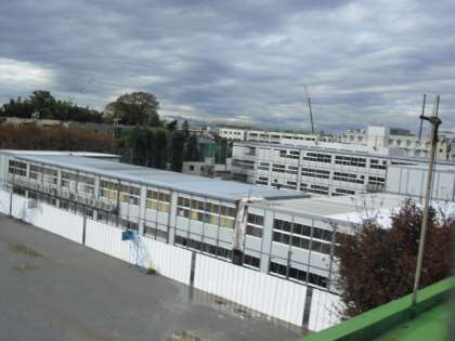 改築工事が進んできました。プレハブの外側の形はすべて出来上がり、今は内部を作っています。北門から入ると小学校と中学校の間に大きなプレハブ棟が見えます。
