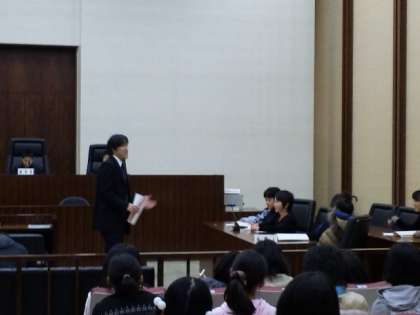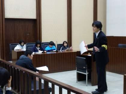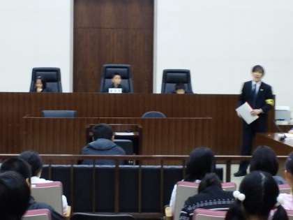 今、模擬裁判中です。裁判官、検察官、弁護人、証人、被告人が決まりました。希望者がとても多くてジャンケンで決まりました。みんなハキハキと大きな声で裁判を行い、説明をする方に誉められました。学芸会の成果でしょうか。裁判の内容もよく分かり素晴らしかったです。