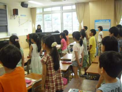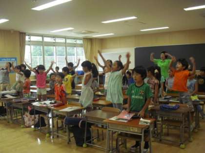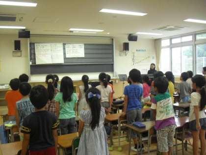 音楽室で2年生の元気な歌声が響きます。だんだん歌に合わせて体が動き始めましたよ。両手をあげてパワフルパワー全開です。
