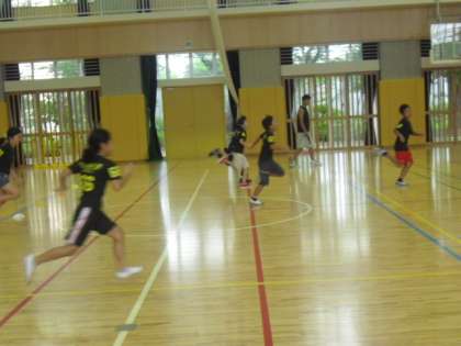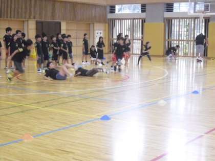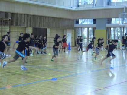 後半は4〜6年生の活動です。瞬発力、判断力など運動を通して様々な力が伸びるように刺激しています。ハンドサインに合わせ、足踏み、前転などをしてからスタートダッシュです・・・・