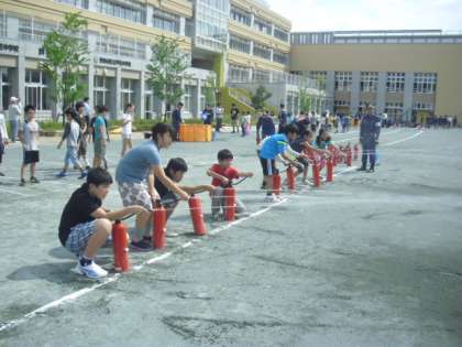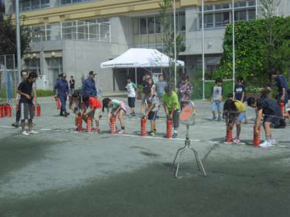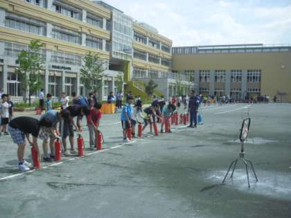 消防団の方のご指導で、消火器を使っての消火訓練です。「火事だ」と声を出し、消火器の線を抜いて火を消す体験です。