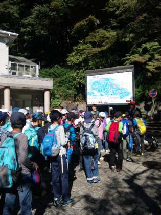 高尾山の入口に着きました。これから5、6年の班ごとに頂上をめざして登山開始です。