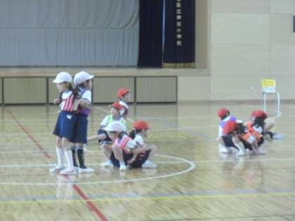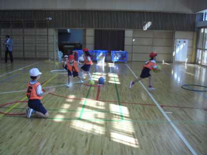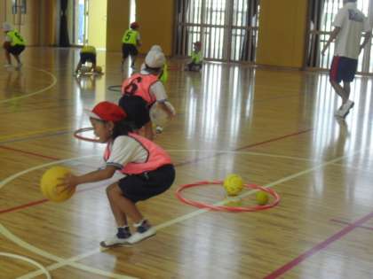 体育館で1年生の体育です。体のバランスをとる運動遊びで背中を合わせ立ったり座ったり・・・友だちと声を掛け合って頑張っていました。その次はボールゲットゲーム・・・できるだけ早く自分の輪にボールを3個運ぶゲームです。どうやったらうまく運べるか、工夫して取り組んでいました。