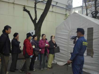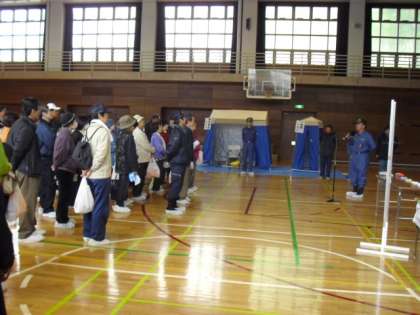 10時からは一般の参加者を交えての避難所運営訓練・防災訓練です。役員の方たちがそれぞれの担当の説明をします。一般の方たちもとても熱心に訓練に参加してくださいました。