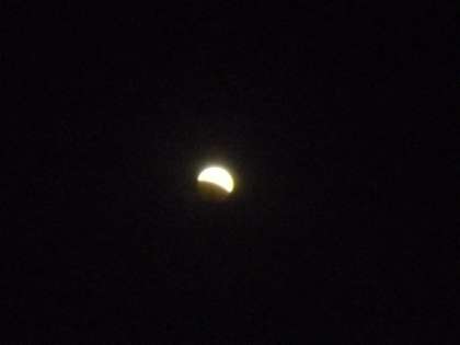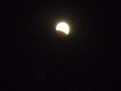 今夜は皆既月食を観測するチャンスの日です。午後6時50分頃、半月のような形になりました。午後7時24分頃には、月が赤い満月になり暗く見えるそうです。午後8時24分ごろから明るく細い月がまた表れてきますよ・・・・