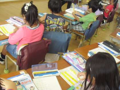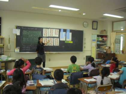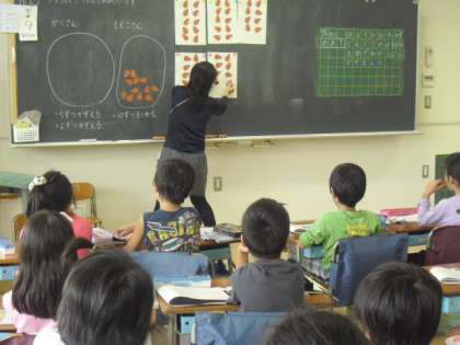 算数の時間に、見ただけでは分からないどんぐりの数を、ぱっと見て分かるようにス類はどうしたらよいか考えていました。今までの数え方を思い出して、「2ずつ数える。」「5ずつ数える。」「10のまとまりを作ってみる」とアイデアが出され、10のまとまりに整理して数えることになりました。その後はみんなもブロックを使って数を表し、十の位、一の位の用語と意味について学びました。