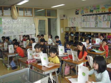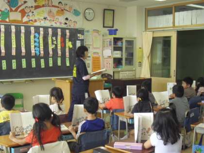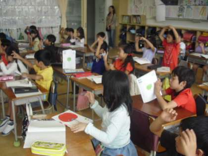 漢数字の音読みと、訓読みが入った「かぞえうた」を楽しく読み、いろいろな物の数え方を知る学習です。ひよこは・・・ふうせんは・・・と、どんな数え方をするのか考えながら歌を作り、みんなで動きもつけて楽しみながら読み進めていました。