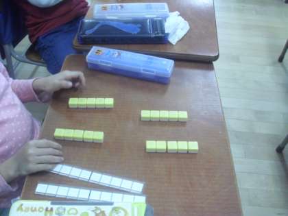 問題の1つ分、いくつ分を正しく理解させるために式で表されている意味をブロックの並びで確認していました。