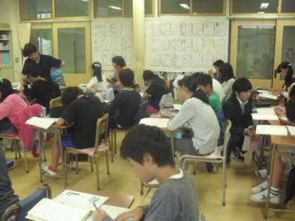 6年生のクラスで算数の問題に挑戦・・本年度は6年生の全クラスで2人の指導者でのティームティーチングを実施して個に応じた指導の機会を増やしています。毎週水曜日は芦花中学校の数学の先生が一緒に指導しています。移動時間ゼロの利点を活かし、小中連携をしています。