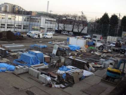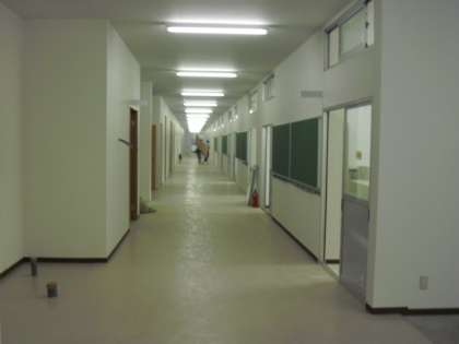 内部は白い壁でとても明るく感じました。プレハブ棟から校庭を見ると、まだ機材がたくさん置いてありますが、なかなか広く感じます。