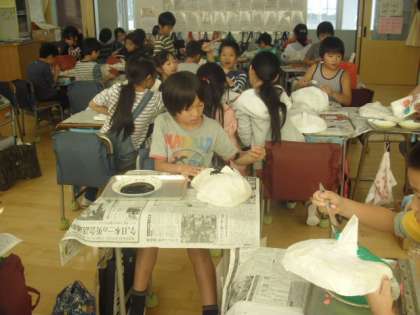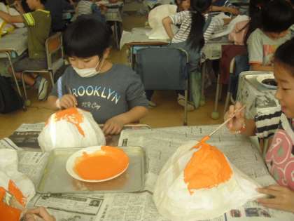 土台に紙を貼り、形になったはりこのお面に、刷毛を使って色付けをする段階でした。