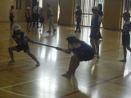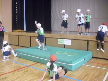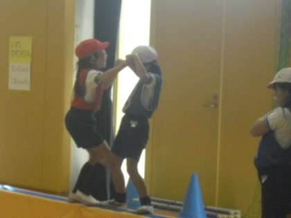 平均台やマットを使って体のバランスをとったり、移動したりする動き、体育棒を使って力試しの運動に挑戦しました。