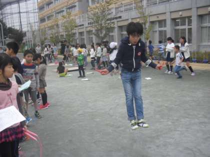 2時間目終了のチャイムの合図とともに、短縄と縄跳びカードを手にした子どもたちが校庭に集まってきました。みんな短縄とびに挑戦開始です!