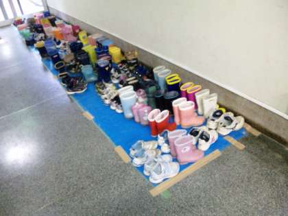今日は雨の一日で芦花中学校の体育館へ移動するのも大変でした。昇降口にビニールシートを敷いて、その上に長靴と傘を並べます。その後を主事さんがモップを持ってしずくを拭きながら体育館まで追いかけます。
