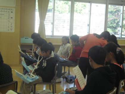 6年生が鍵盤ハーモニカでパート練習をしています。