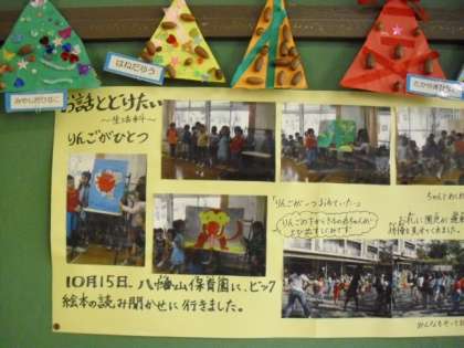 教室に「おはなしとどけ隊」で八幡山保育園にいったときの様子が掲示してありました。2年生が保育園生に生き生きと大型えほんの読み聞かせを行っている様子がわかり、いろいろな場面で頑張っている2年生に拍手を送りたくなりました。