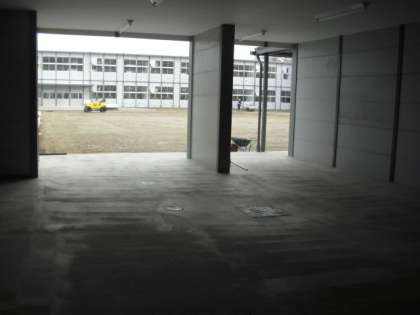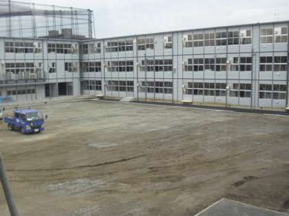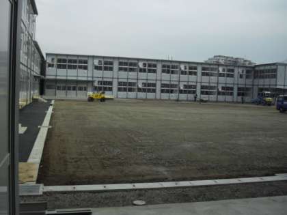 プレハブから見た新校庭です。以前お見せしたときより校庭が広く見えます。工事も終了に近いので使っていた機材が整理されてほとんどなくなったからです。