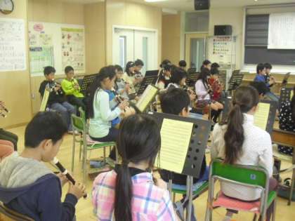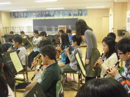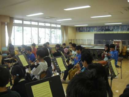 音楽室で、カノンの曲をリコーダ—演奏していました。