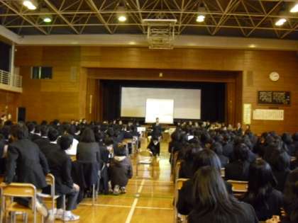 おごそかな会の場面とチーム対抗クイズの場面とがらっと趣を変えて行いました。クイズになると中学生も乗ってきてとても楽しい会になりました。