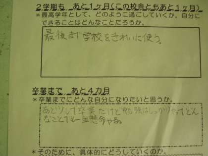 掲示板に「2学期もあと1か月 最高学年としてできることは何だろう」という問いかけに「最後まで学校をきれいに使う」「あと少しで卒業だけど、勉強はしっかりやってどんなことでも一生懸命やる」と書いた用紙が貼ってありました。6年生素晴らしいです。心から応援しようと思いました。、